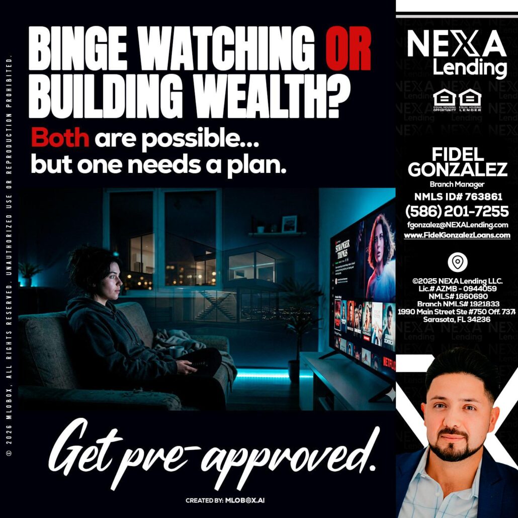 BINGE WATCHING - Fidel Gonzalez -Branch ManagerHi, my name is Fidel Gonzalez. I’m a Loan Officer with NEXA Lending LLC., offering personalized mortgage solutions, fast customized quotes, great rates and service with integrity.