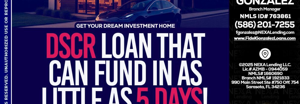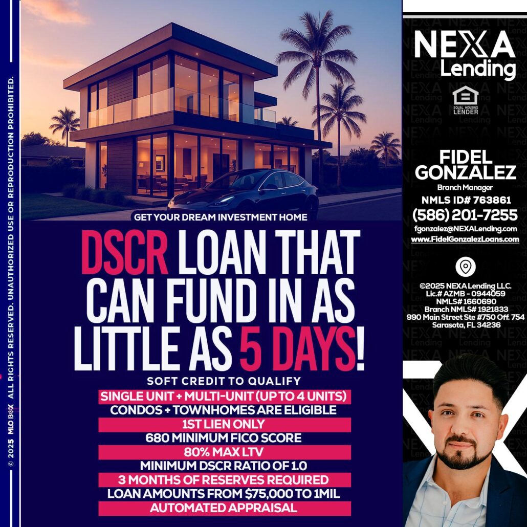 DSCR - Fidel Gonzalez -Branch ManagerHi, my name is Fidel Gonzalez. I’m a Loan Officer with NEXA Mortgage LLC., offering personalized mortgage solutions, fast customized quotes, great rates and service with integrity.