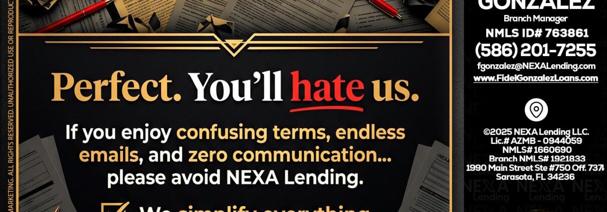 YOU WILL HATE US! - Fidel Gonzalez -Branch ManagerHi, my name is Fidel Gonzalez. I’m a Loan Officer with NEXA Lending LLC., offering personalized mortgage solutions, fast customized quotes, great rates and service with integrity.